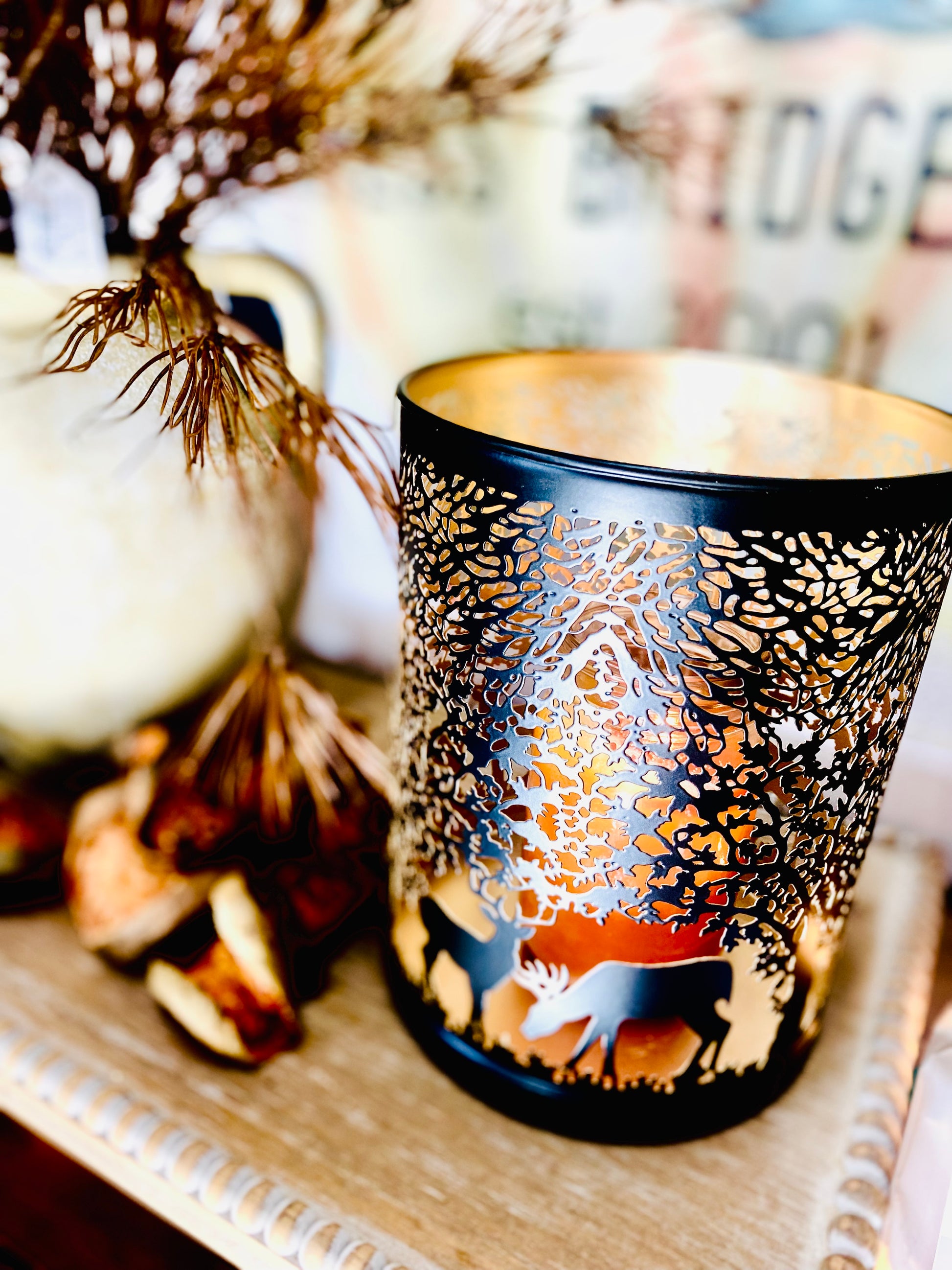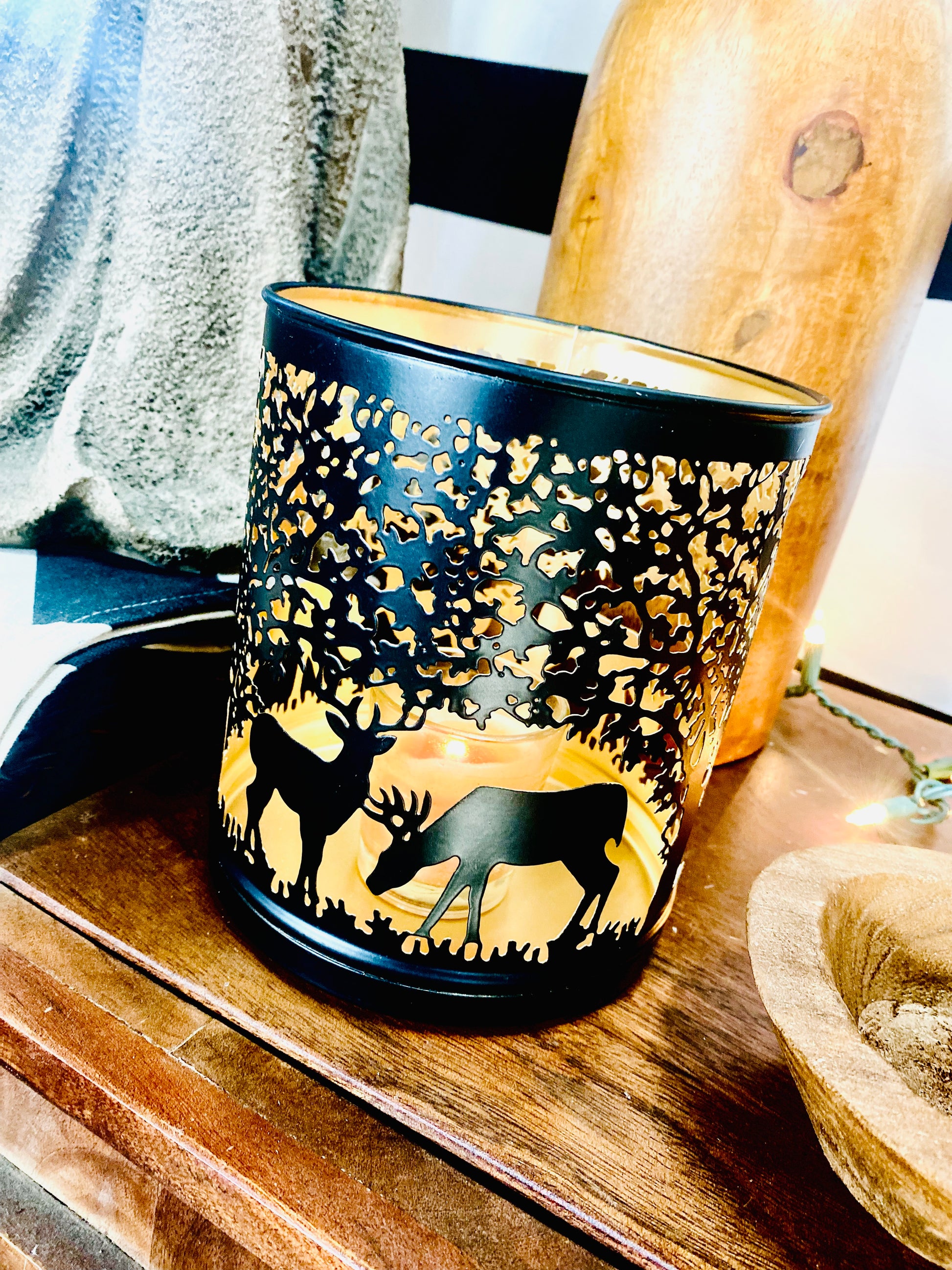 - Bring woodland magic into your home with the Forest Deer Metal Luminary Lantern! This charming candle holder features intricate deer silhouettes crafted from sturdy black iron, perfect for casting enchanting shadows and creating an intimate glow. Available in two sizes, it's ideal for tabletops, shelves, or outdoor spaces. Simply wipe with a damp cloth to maintain its beautiful finish. Let this whimsical luminary set the mood for cozy evenings and festive gatherings.